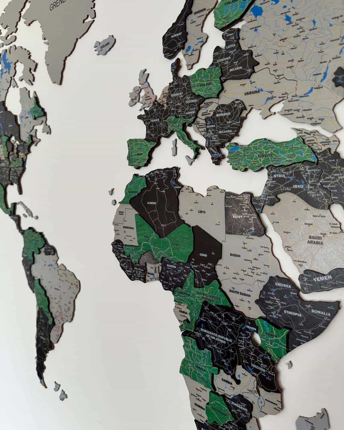 Mapa świata 3D Premium z drewna | FOREST Sikorka® to elegancka i unikalna ozdoba, która wzbogaci każde wnętrze. Ta ręcznie wykonana mapa na szarej podstawie z zielonymi akcentami nie tylko przyciąga wzrok, ale również edukuje, prezentując granice państw, nazwy stanów i większych miast, a także rzeki, jeziora i główne drogi. Dzięki trójwarstwowej konstrukcji mapa tworzy fascynujący efekt trójwymiarowy, który dodaje przestrzeni głębi i wyjątkowego uroku.